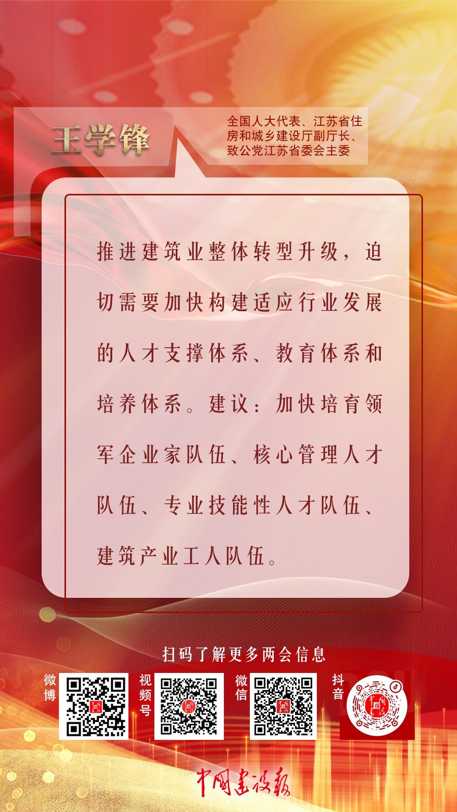 王学锋表示,随着建筑业向工业化、数字化、绿色化转型,现有人才体系暴露出一些短板,比如,缺少足够的与时俱进的企业领军人,核心管理人才和技术骨干供求矛盾突出,庞大的劳务工人队伍整体能力较弱。为此,她建议: