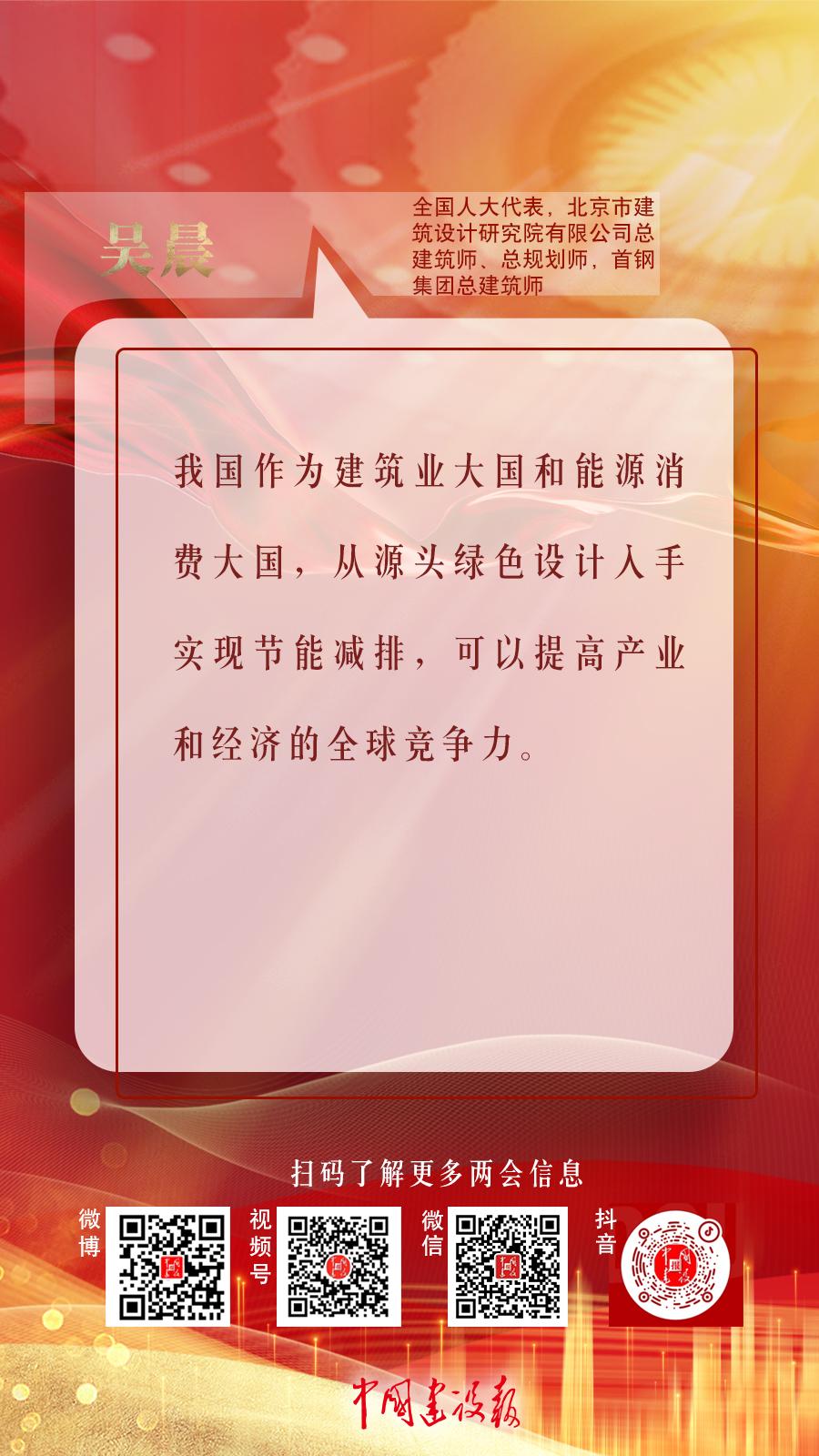 “绿色设计对实现‘双碳’目标可以起到事半功倍的作用。”全国人大代表,北京市建筑设计研究院有限公司总建筑师、总规划师,首钢集团总建筑师吴晨对记者表示,我国作为建筑业大国和能源消费大国,从源头绿色设计入手实现节能减排,可以提高产业和经济的全球竞争力。