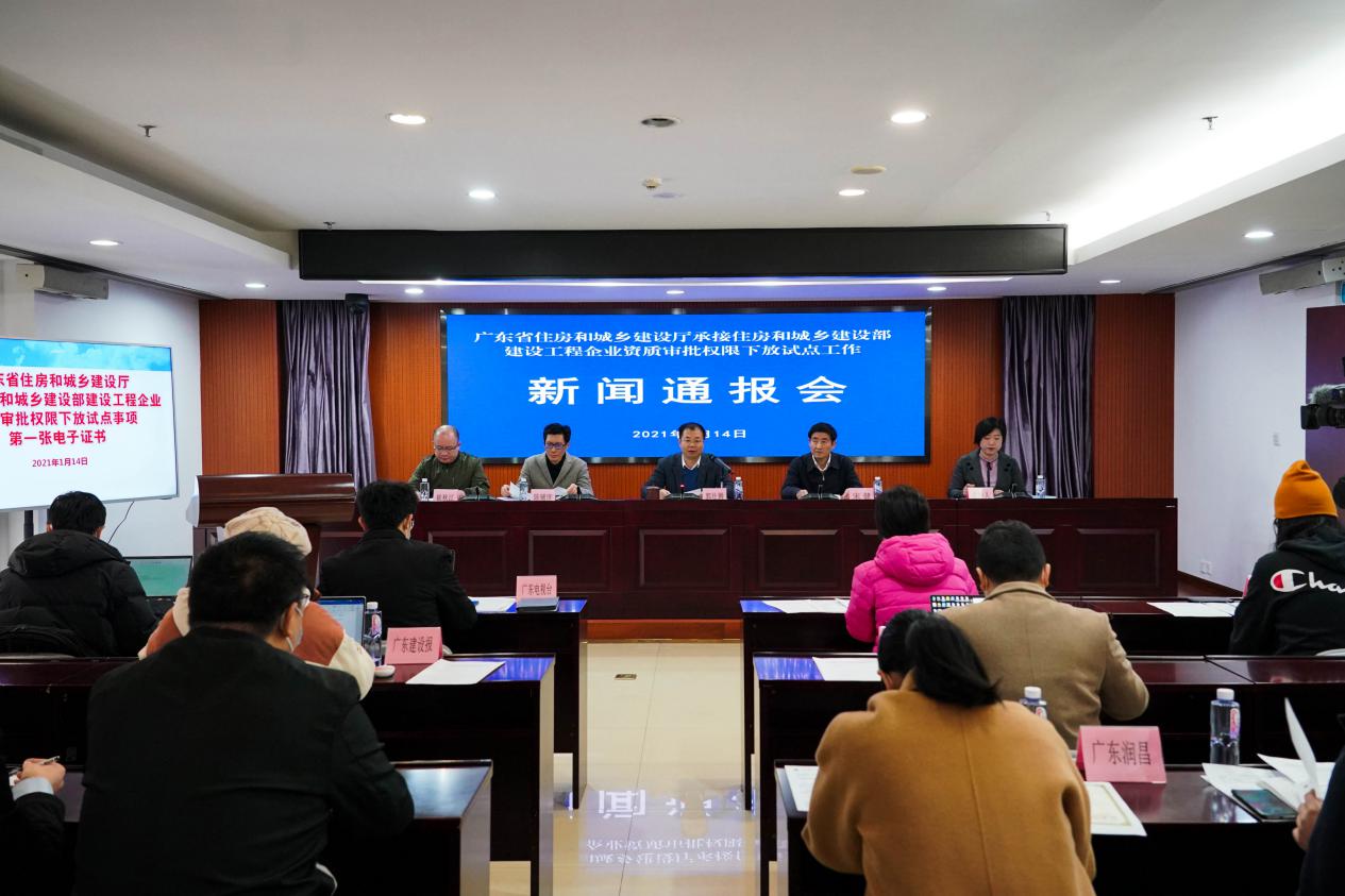 1月14日上午,省住房城乡建设厅副厅长郭壮狮签发了我省承接住房和城乡建设部建设工程企业资质审批权限下放试点的第一张资质电子证书(广东润昌建设工程有限公司的建筑工程施工总承包一级资质证书),并在新闻通报会上介绍了广东省承接住房和城乡建设部资质审批权限下放试点工作情况。广东省住房城乡建设厅党组成员、副厅长郭壮狮签发广东省第一张资质审批权限下放试点事项的资质电子证书 2020年12月17日,广东获